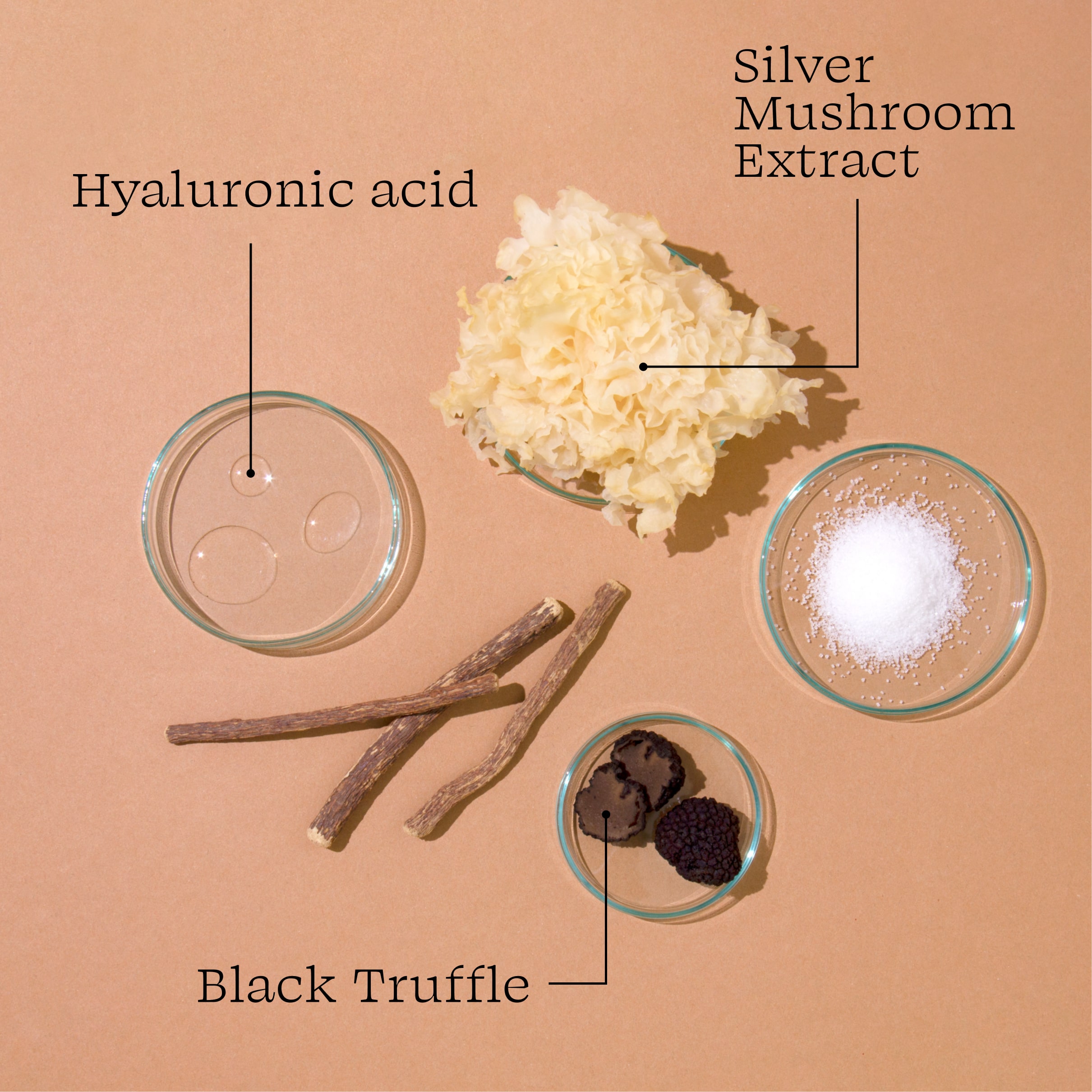 Aqua, glycerin, pentylene glycol, sodium hyaluronate (hyaluronic acid), panthenol, sodium benzoate, sodium levulinate, zinc PCA, xylityl glucoside, anhydroxylitol, citric acid, xylitol, ascorbyl glucoside (vitamin C), glucose, Prunus Domestica fruit extract, Tremella Fuciformis (silver ear) extract, Tuber Melanosporum (truffle extract), Glycyrrhiza Glabra (liquorice root) extract.