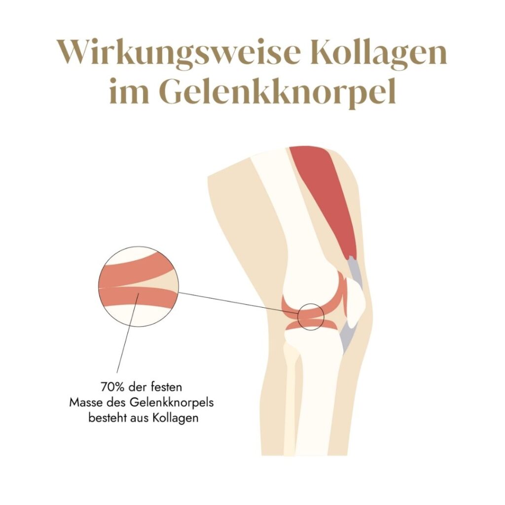 Dieses besteht nämlich fast hauptsächlich aus Kollagen. Dies ist das größte und wichtigste Strukturprotein in unserem Körper. Es durchzieht das gesamte Bindegewebe, Sehnen und Gelenke. Und es bildet eben unseren Knorpel – somit schützt es unsere Gelenke direkt.