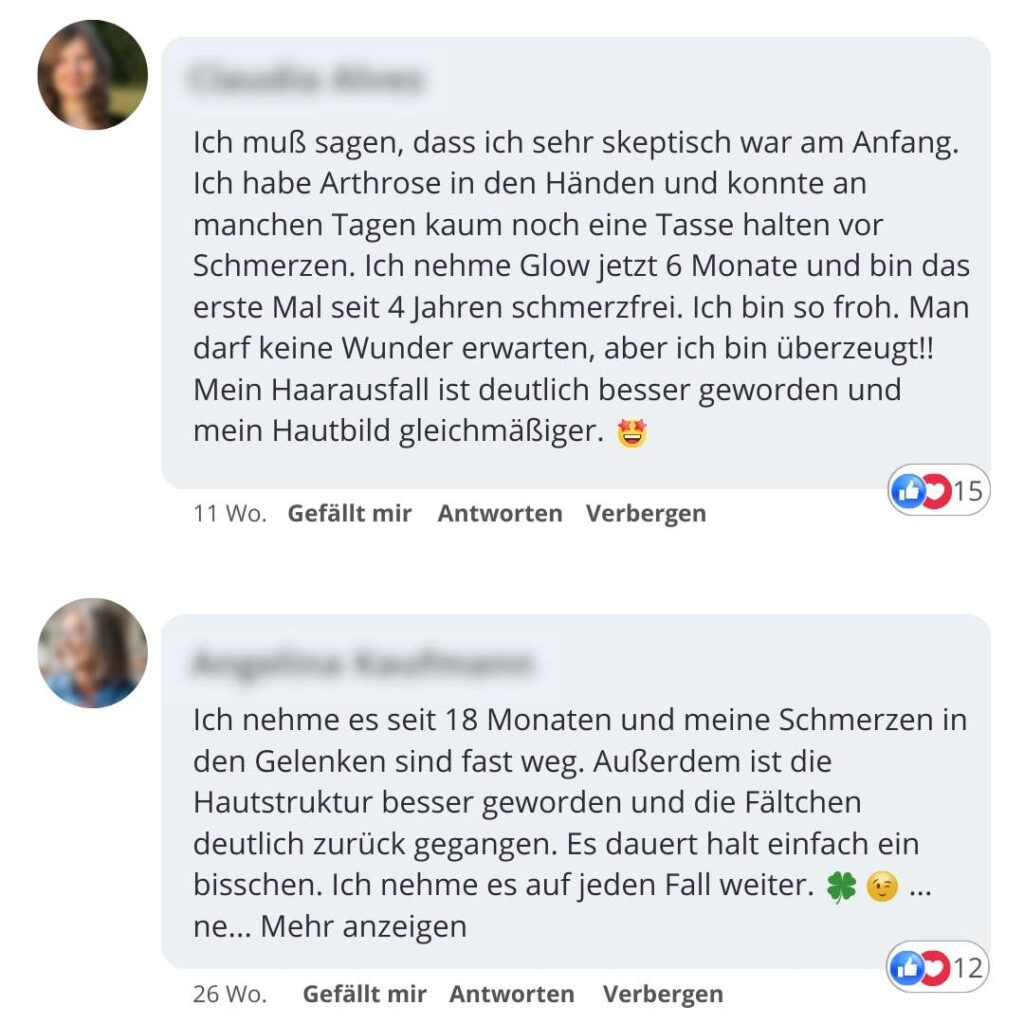 Anstoß der Aussage? Eine 62-jährige nahm 7 Wochen lang Kollagenpulver der Marke Glow25 gegen Falten und ihre starke Arthrose in den Fingern zu sich. Sie konnte nicht einmal mehr vernünftig Kartoffeln schälen.